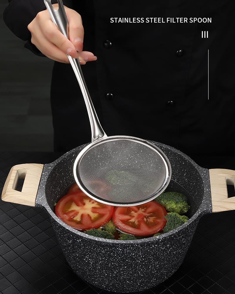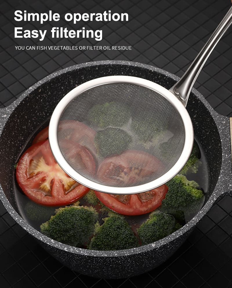 Saringan jaring halus dapat memisahkan berbagai bahan dan kotoran. Sempurna untuk pemisahan busa mengambang, lemak, minyak, penyaringan kotoran minyak dan sayuran dari air. Ideal untuk memasak sehari-hari.